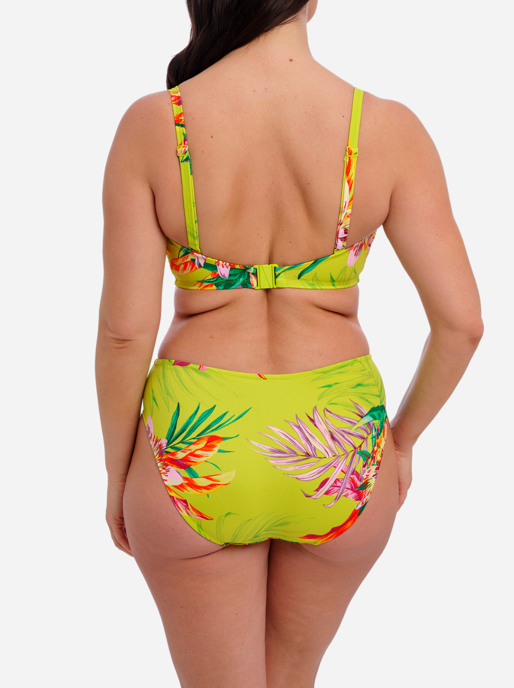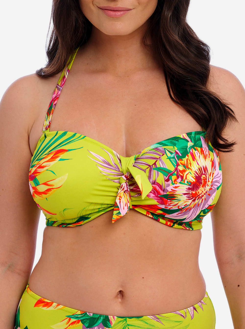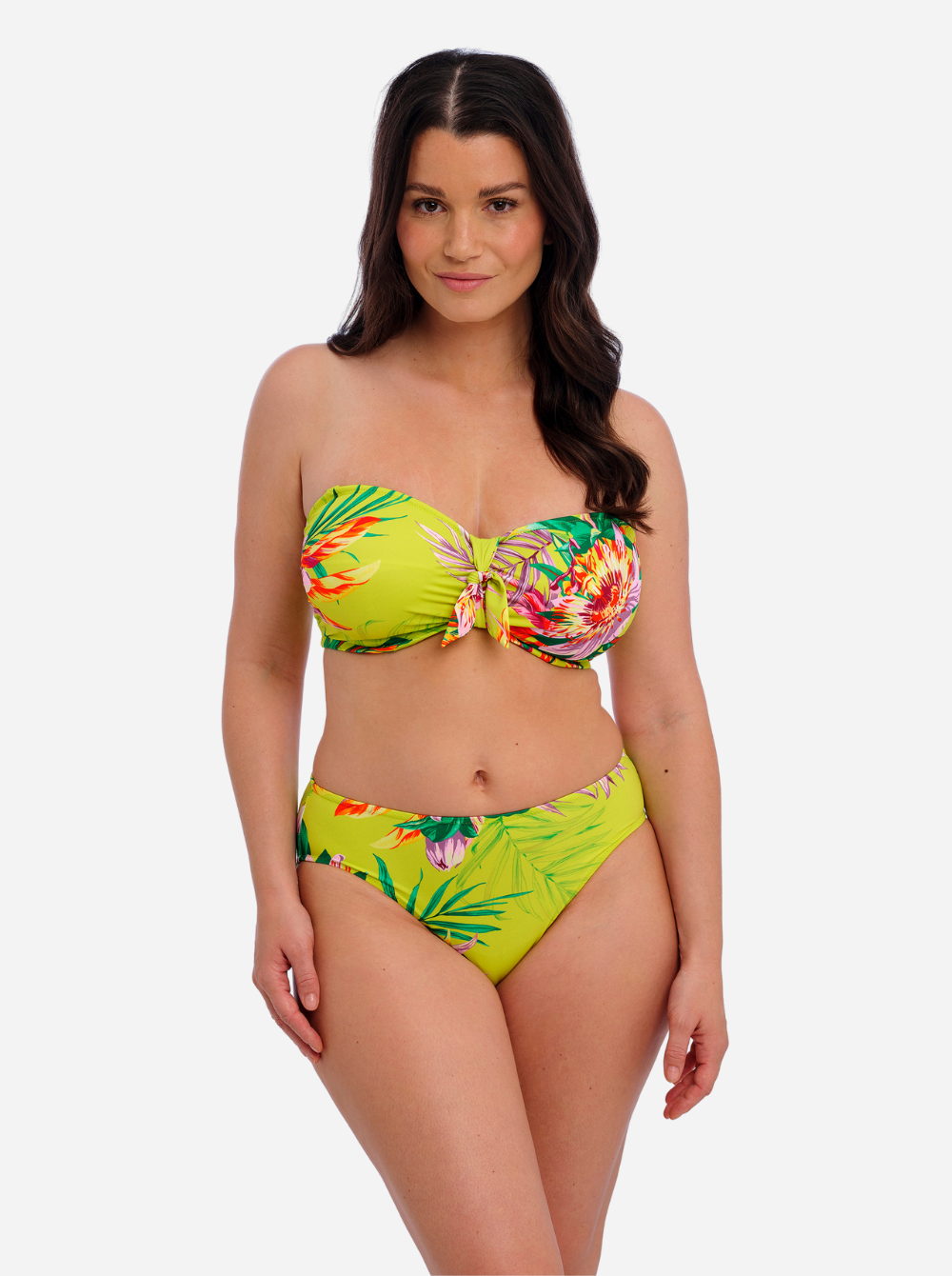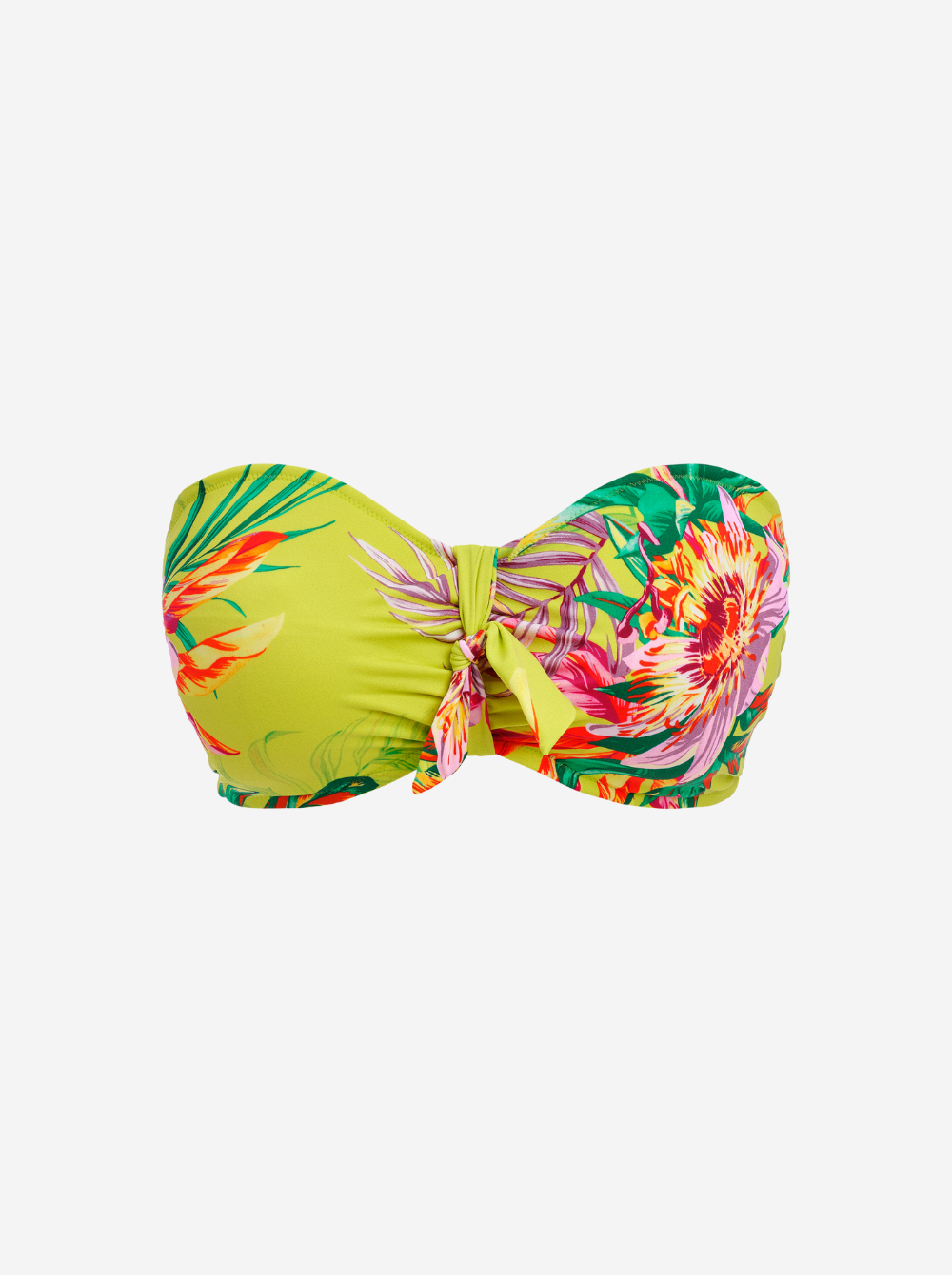 Fantasie's 'Cala Macarella' bikini top is printed with lush tropical blooms against a zesty green backdrop. Designed with flattering ruching, it has a bandeau shape and concealed underwiring for exceptional support up to a cup size G. Wear it with the matching bikini briefs on your next sunshine escape.