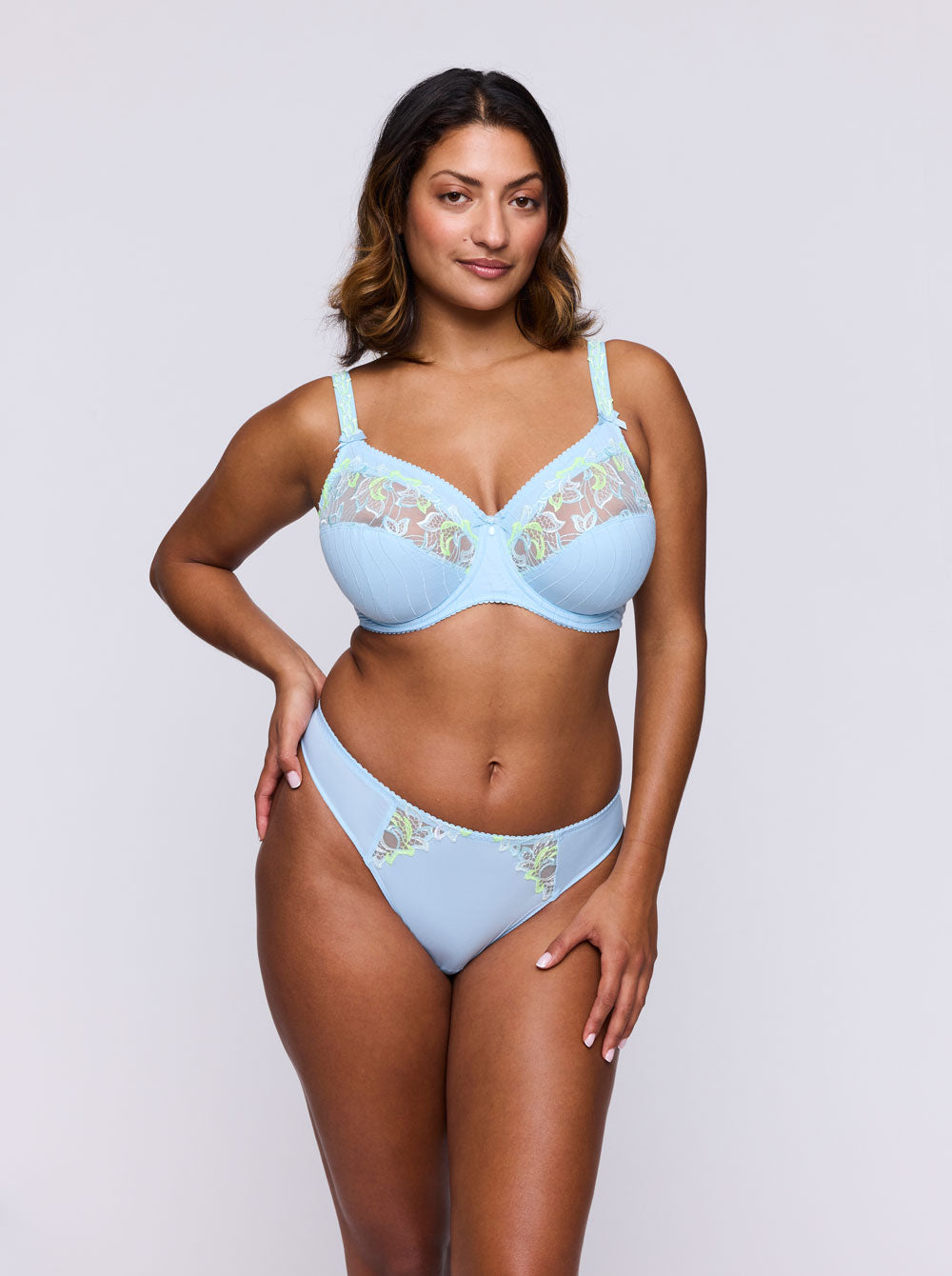 Prima Donna's pale blue 'Deauville' thong is crafted from ultra-soft and lightweight microfibre. It's designed to sit comfortably at the hips and inserted with panels of floral-embroidered tulle. It'll look so chic paired with the coordinating bra.