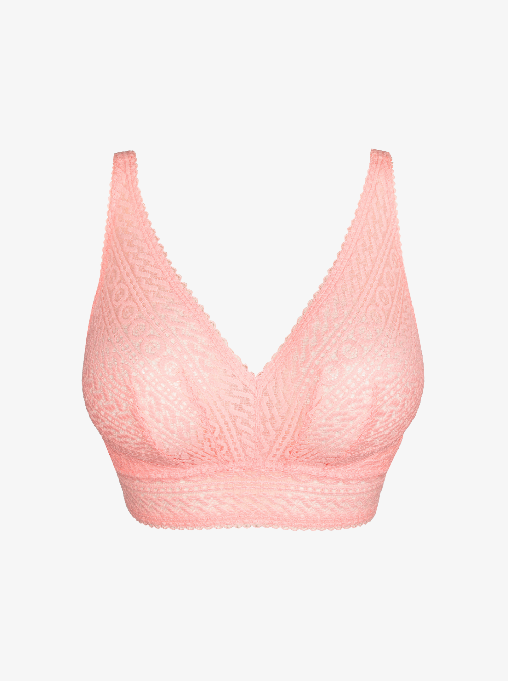 Prima Donna's peach-pink 'Montara' bra is designed to offer optimum support for fuller busts without compromising on comfort. Made from graphic stretch lace, its shaped with soft, underwire-free cups and a wide elasticated, hook and eye-fastening back strap.