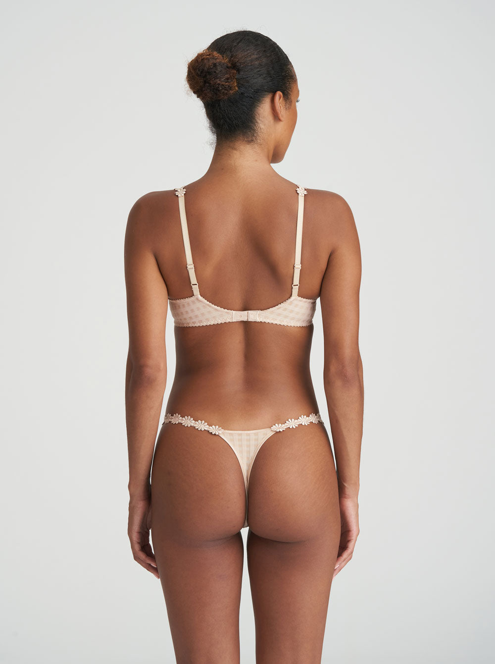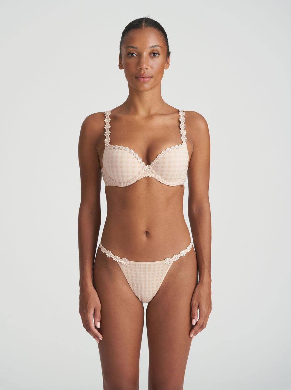 Marie Jo's beige 'Avero' thong looks especially pretty when worn with the coordinating bra. It's crafted from ultra-soft checked jersey and has daisy embroidered sides that sit low on the hips.