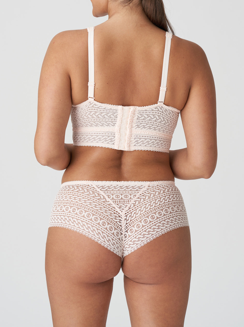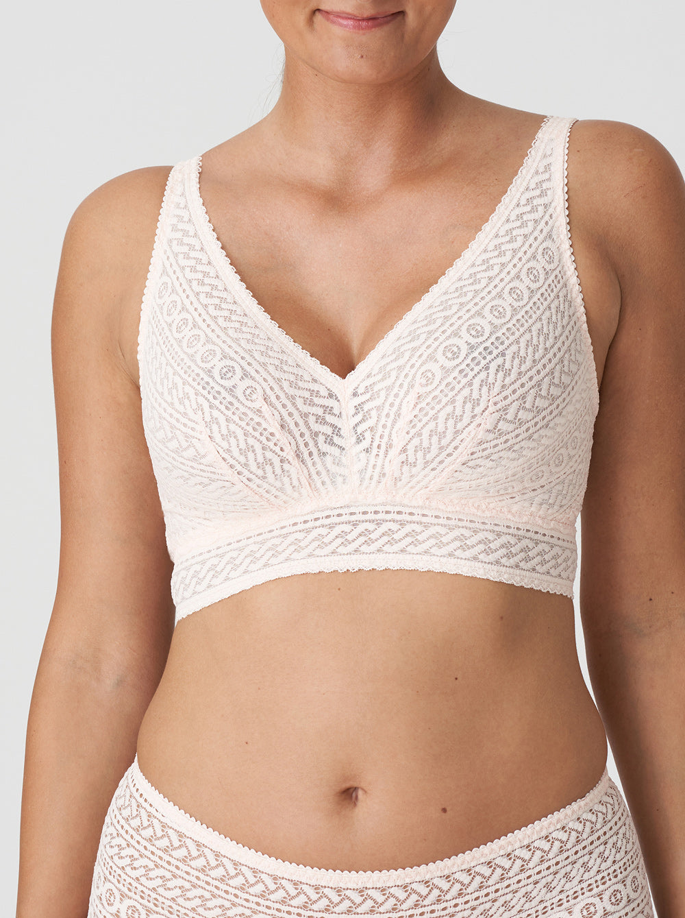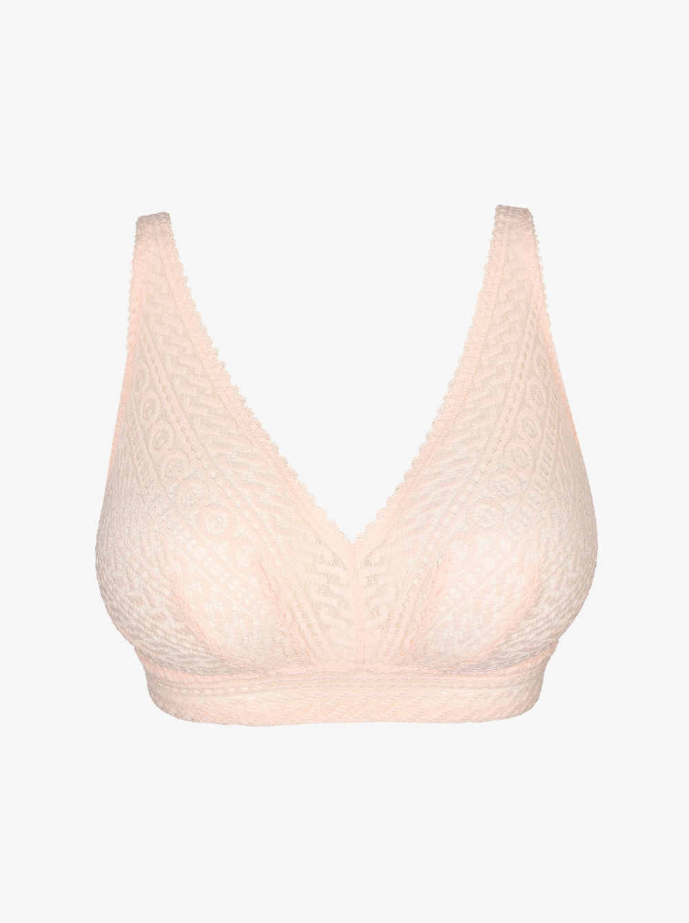 Prima Donna's soft pink 'Montara' bra is designed to offer optimum support for fuller busts without compromising on comfort. Made from graphic stretch lace, its shaped with soft, underwire-free cups and a wide elasticated, hook and eye-fastening back strap.