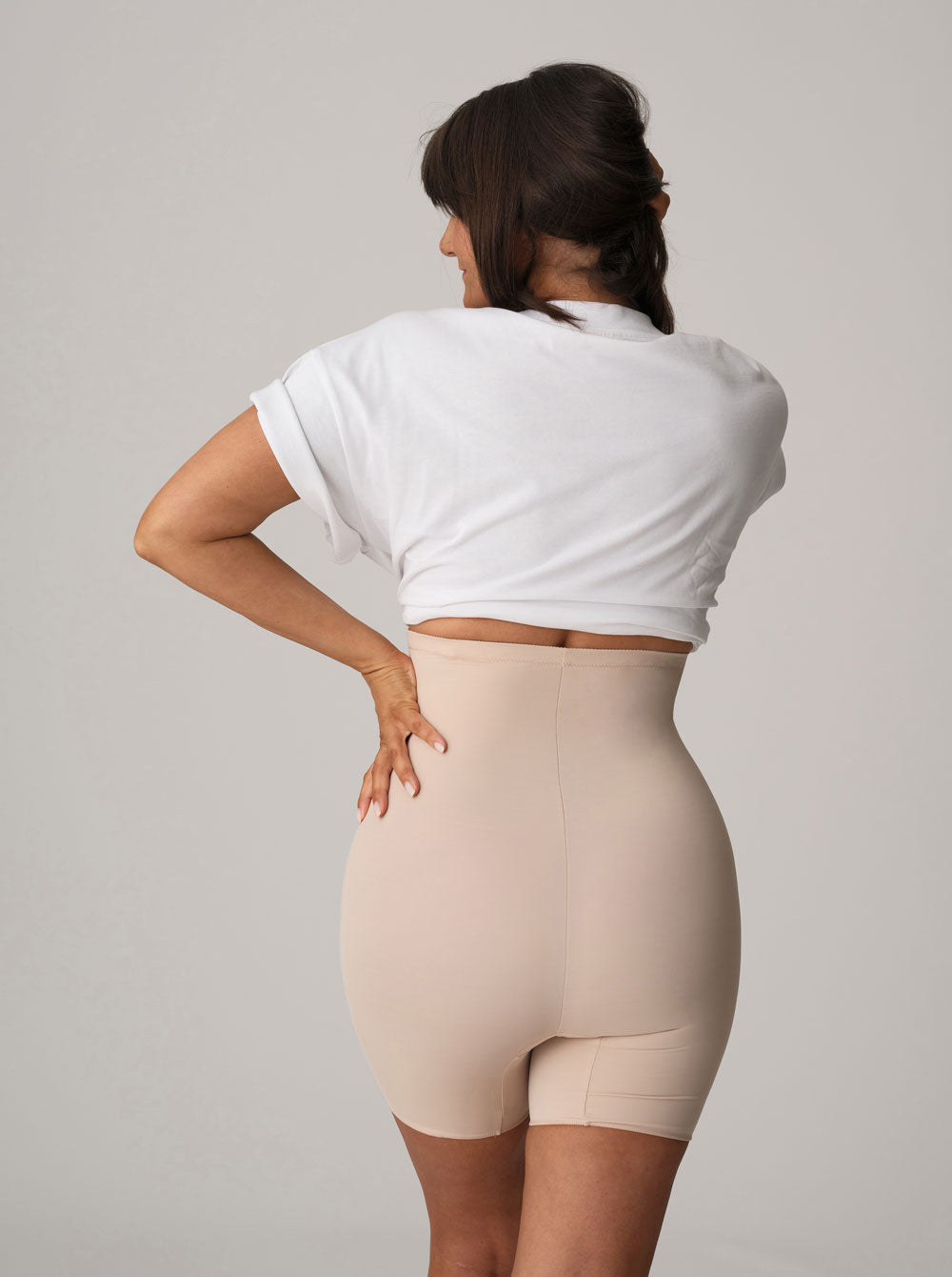 Prima Donna's beige 'Perle' shapewear shorts are designed to flatteringly smooth your stomach and hips. With a high-rise, mid-thigh cut, they're crafted from a sculpting stretch fabric that's firm but not restrictive and have internal gummed strips to ensure they stay comfortably in place.