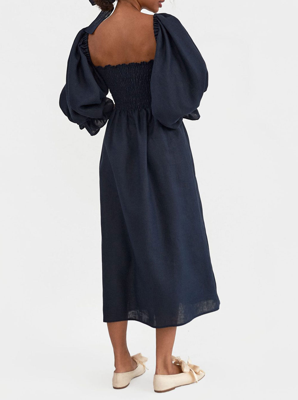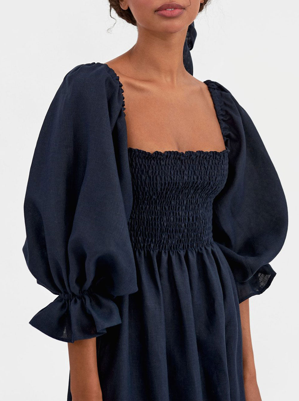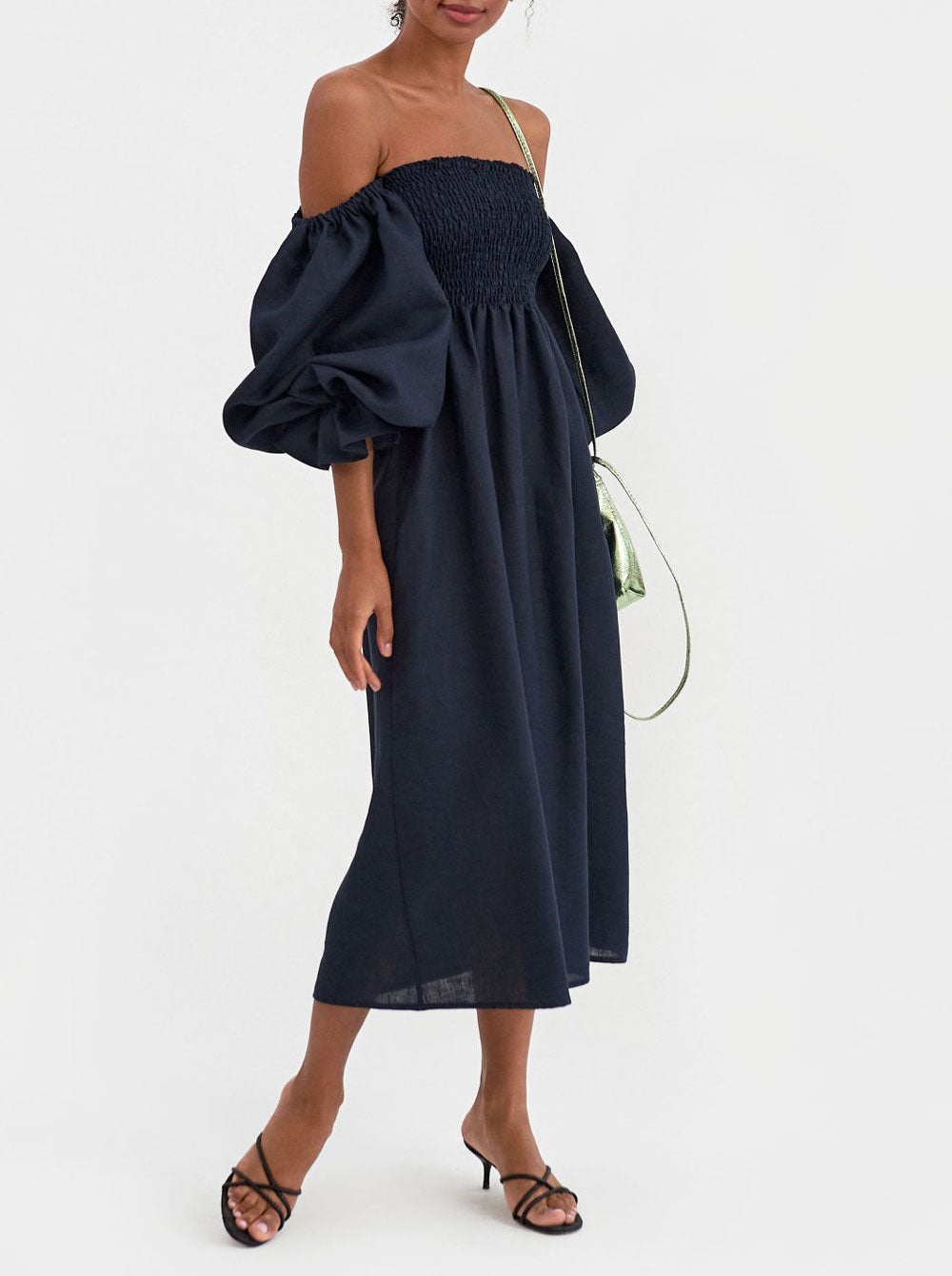 Sleeper's navy 'Atlanta' dress is the label's best-selling style. It's handcrafted from breezy linen to a midi silhouette with a shirred bodice and balloon sleeves that can be worn on or off the shoulders. Style yours with sandals and a woven tote.