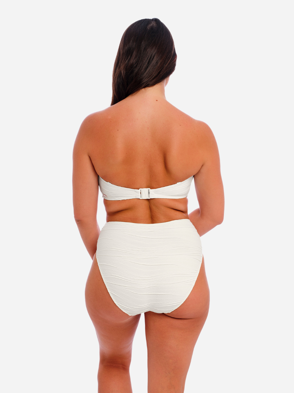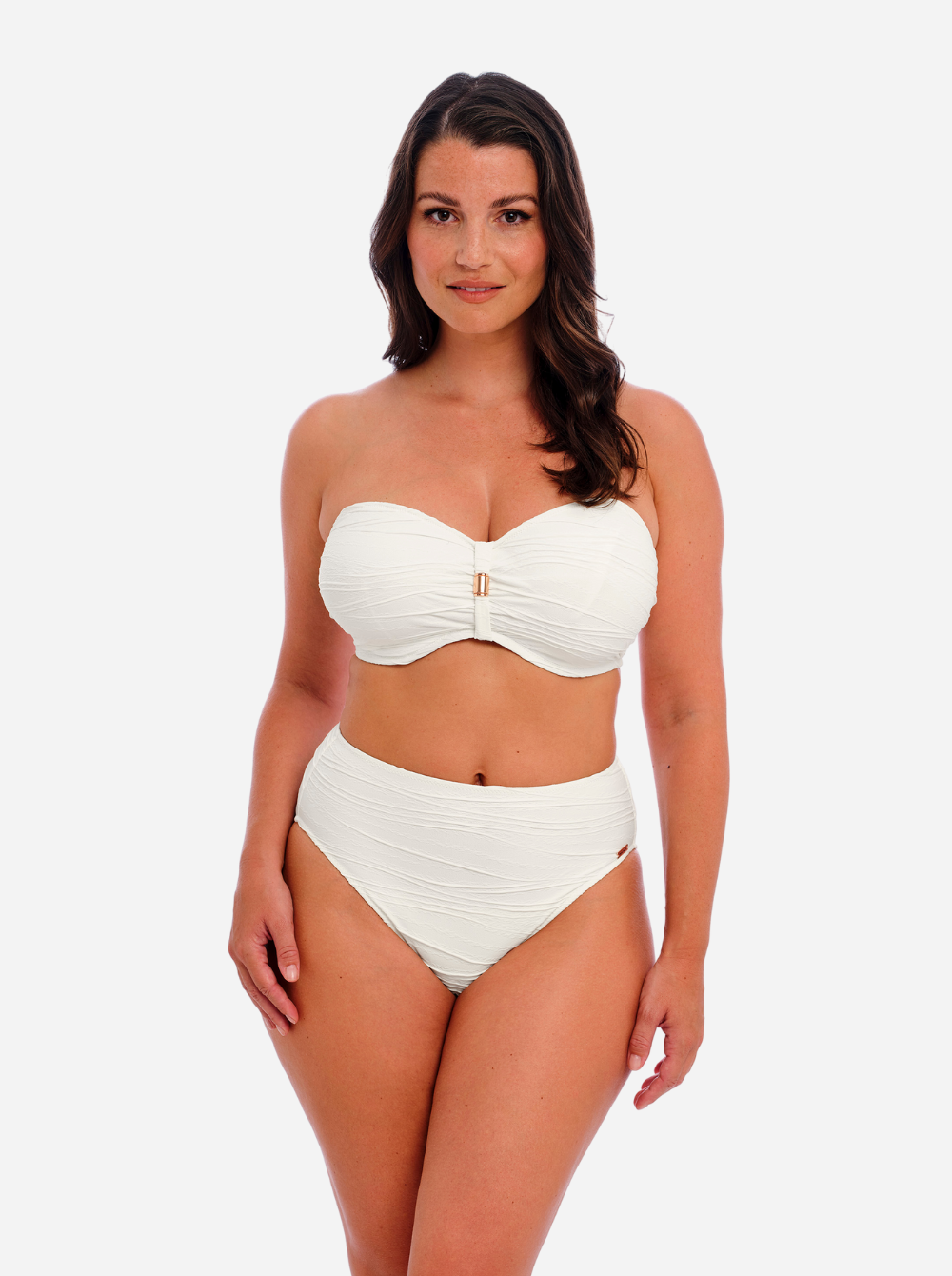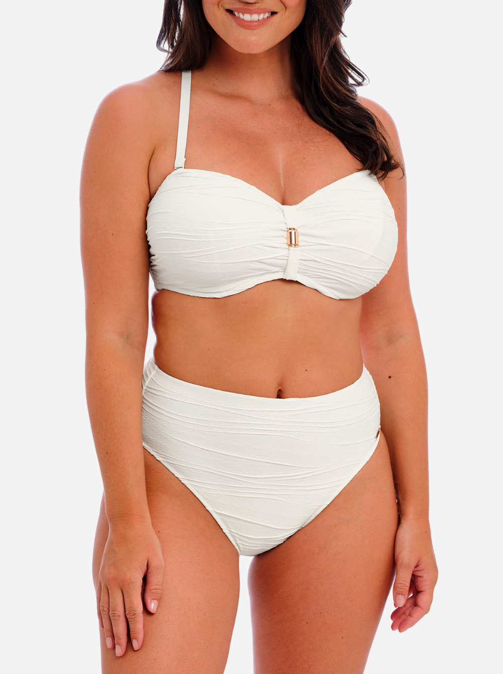 Fantasie's bestselling 'Beach Waves' bikini top is reinvented in a fresh white that beautifully complements sun-kissed skin. Designed with flattering ruching, it has a bandeau shape and concealed underwiring for exceptional support up to a cup size H. Wear with the coordinating bikini briefs as an elegant set.