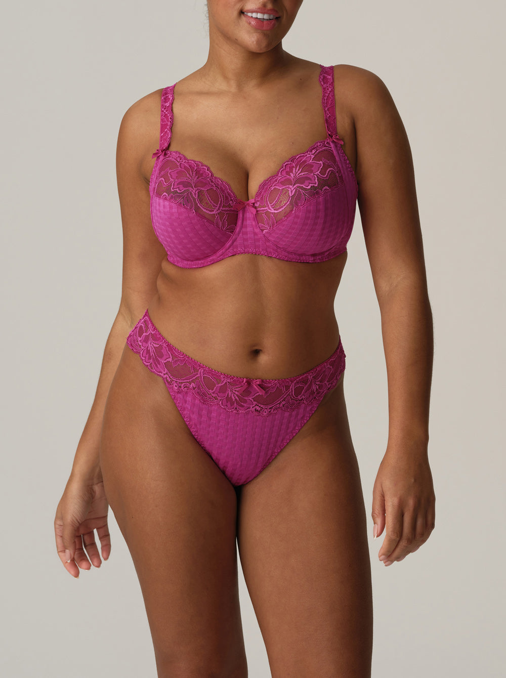 Prima Donna's fuchsia-pink 'Madison' thong is made from a combination of soft microfibre jersey and lace. It offers minimal coverage across the back and has pretty scalloped edges that lay flat against your skin for an invisible finish. Wear it with the coordinating bra.